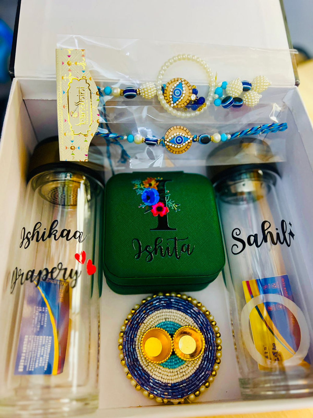 It includes two beautifully crafted rakhis, a small pooja thali perfect for roli and moili, and two glass bottles that can be personalized with names via WhatsApp.
