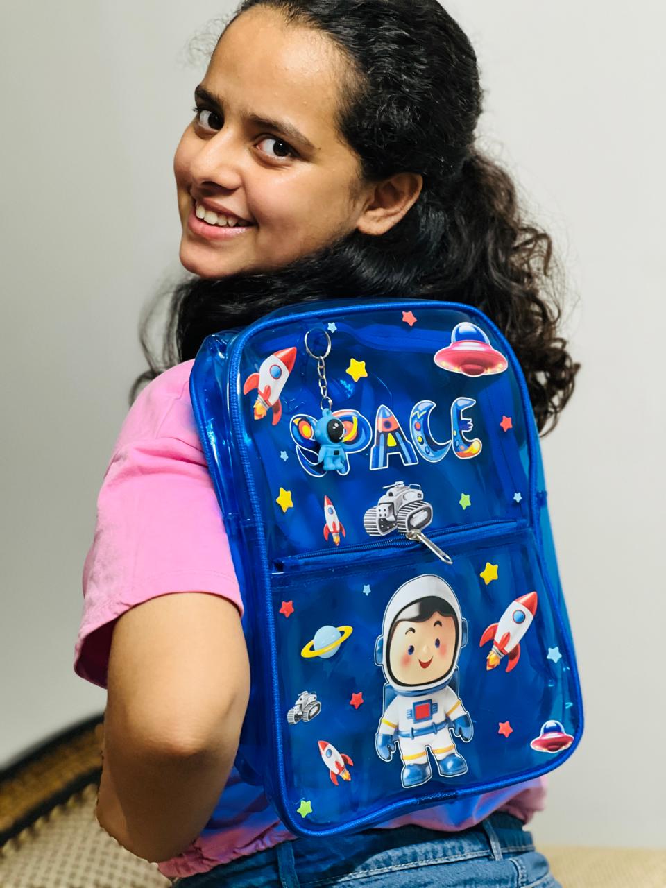 | Jelly Backpack Stylish & Lightweight Transparent Bag with Space Walk Print, Soft Plastic, Adjustable Straps, Sturdy Handle, Premium Zipper & Versatile Design. |